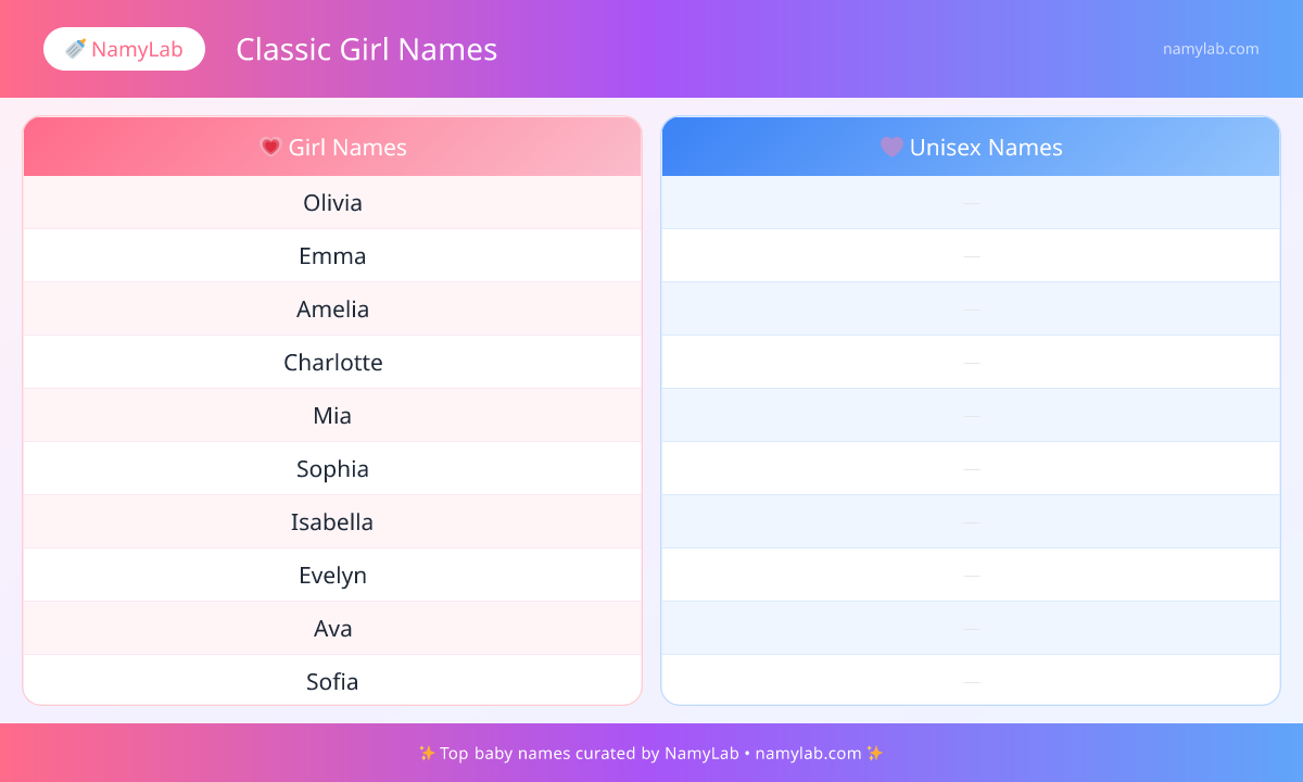 Explore the most searched classic girl names side by side. The infographic below shows the leading names for both boys and girls.