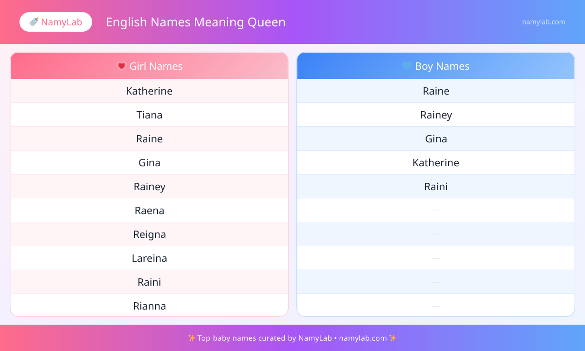 Below is a visual overview of the most popular english names meaning queen for boys and girls. Use this snapshot to compare top picks at a glance.