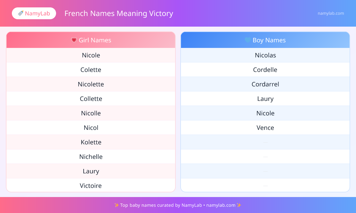 Explore the most searched french names meaning victory side by side. The infographic below shows the leading names for both boys and girls.