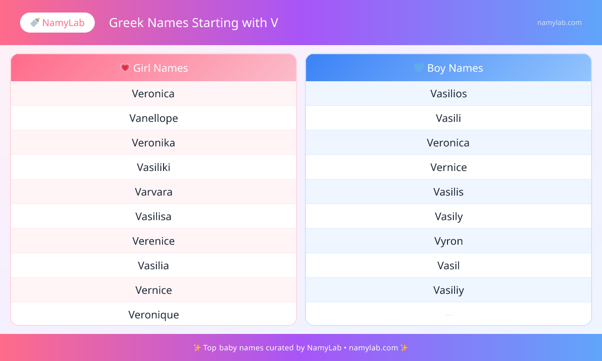 Explore the most searched greek names starting with v side by side. The infographic below shows the leading names for both boys and girls.