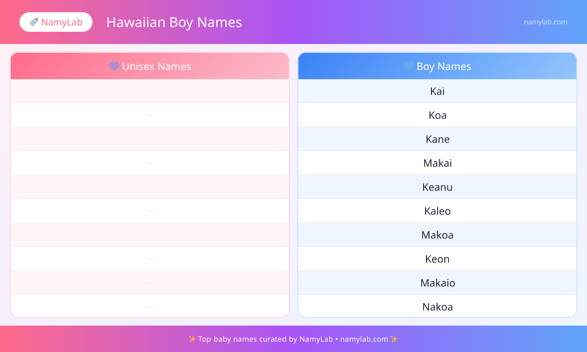 Explore the most searched hawaiian boy names side by side. The infographic below shows the leading names for both boys and girls.