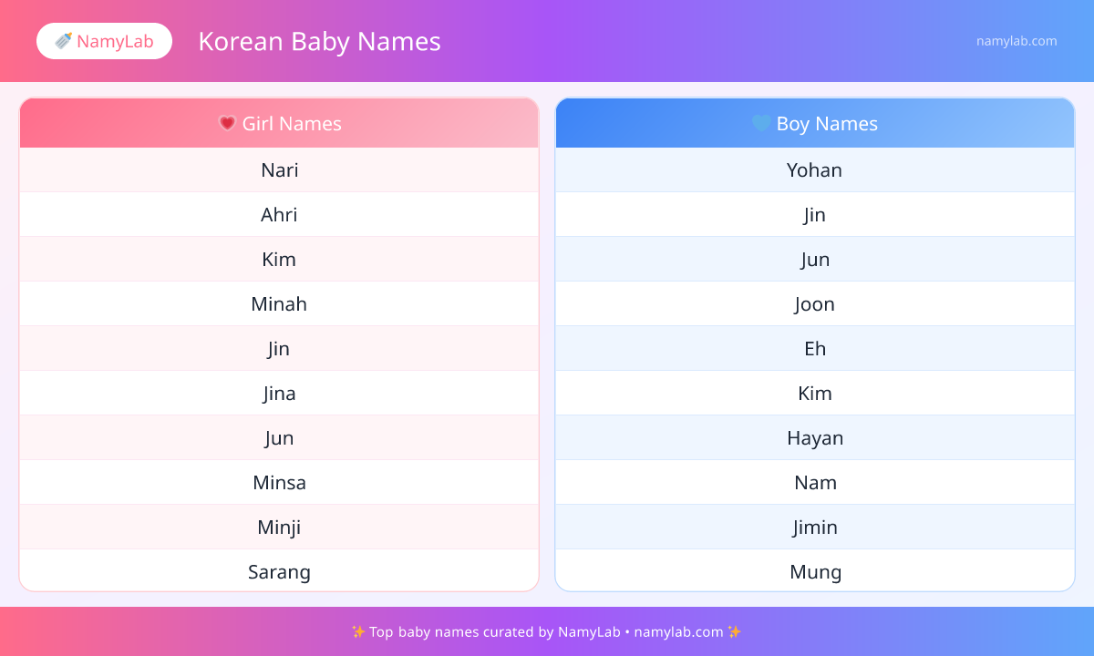Explore the most searched korean baby names side by side. The infographic below shows the leading names for both boys and girls.