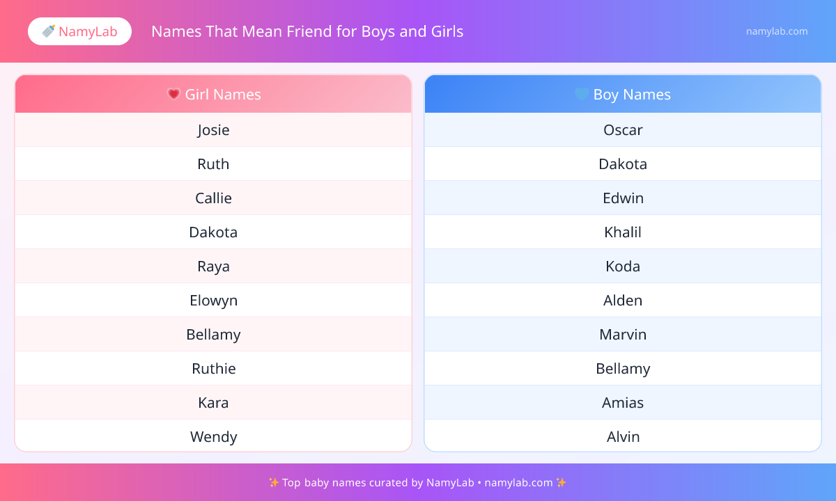 Searching for baby names that mean friend? This page curates 382+ options under "Names That Mean Friend for Boys and Girls" to help you explore meaningful choices faster. If you are exploring names with a specific theme, this collection gives you a focused place to begin.