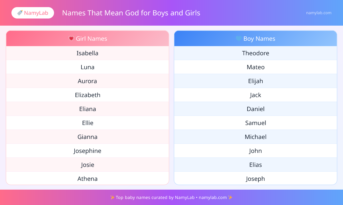 Searching for baby names that mean god? This page curates 5502+ options under "Names That Mean God for Boys and Girls" to help you explore meaningful choices faster. Meaning-focused naming can bring clarity to the process, especially when your shortlist still feels too broad.