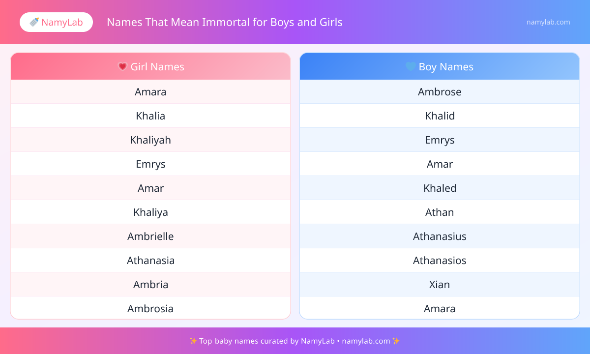Explore the most searched names that mean immortal side by side. The infographic below shows the leading names for both boys and girls.