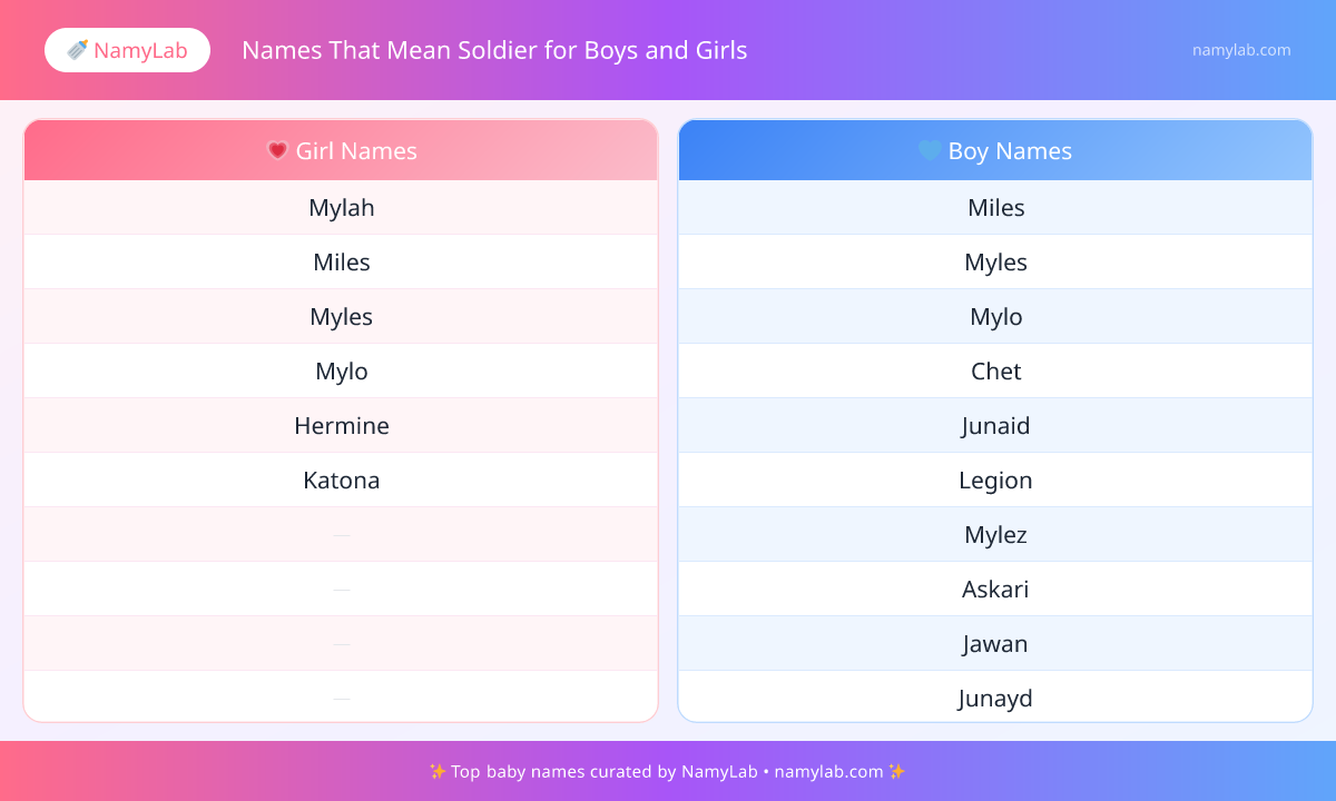 Here is a quick visual guide to the most popular names that mean soldier, organized by gender so you can spot trends and favorites instantly.