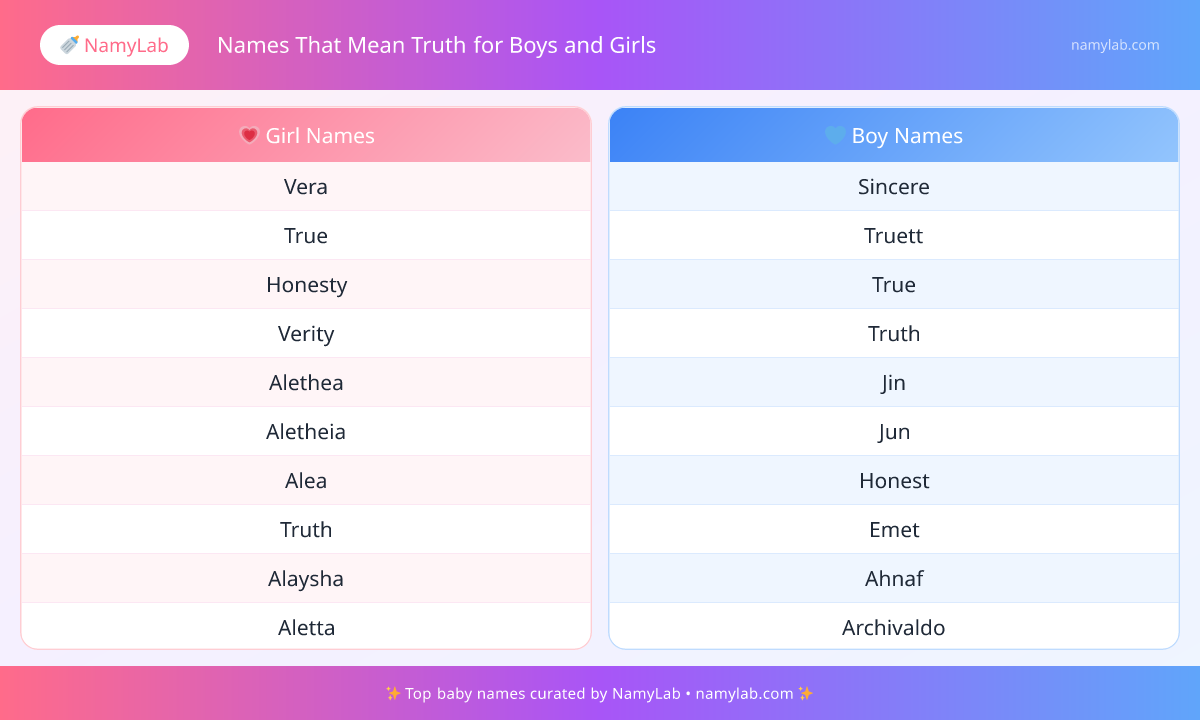 Searching for baby names that mean truth? This page curates 97+ options under "Names That Mean Truth for Boys and Girls" to help you explore meaningful choices faster. If you already know the vibe you want, this list helps you match that feeling to names you can actually use.
