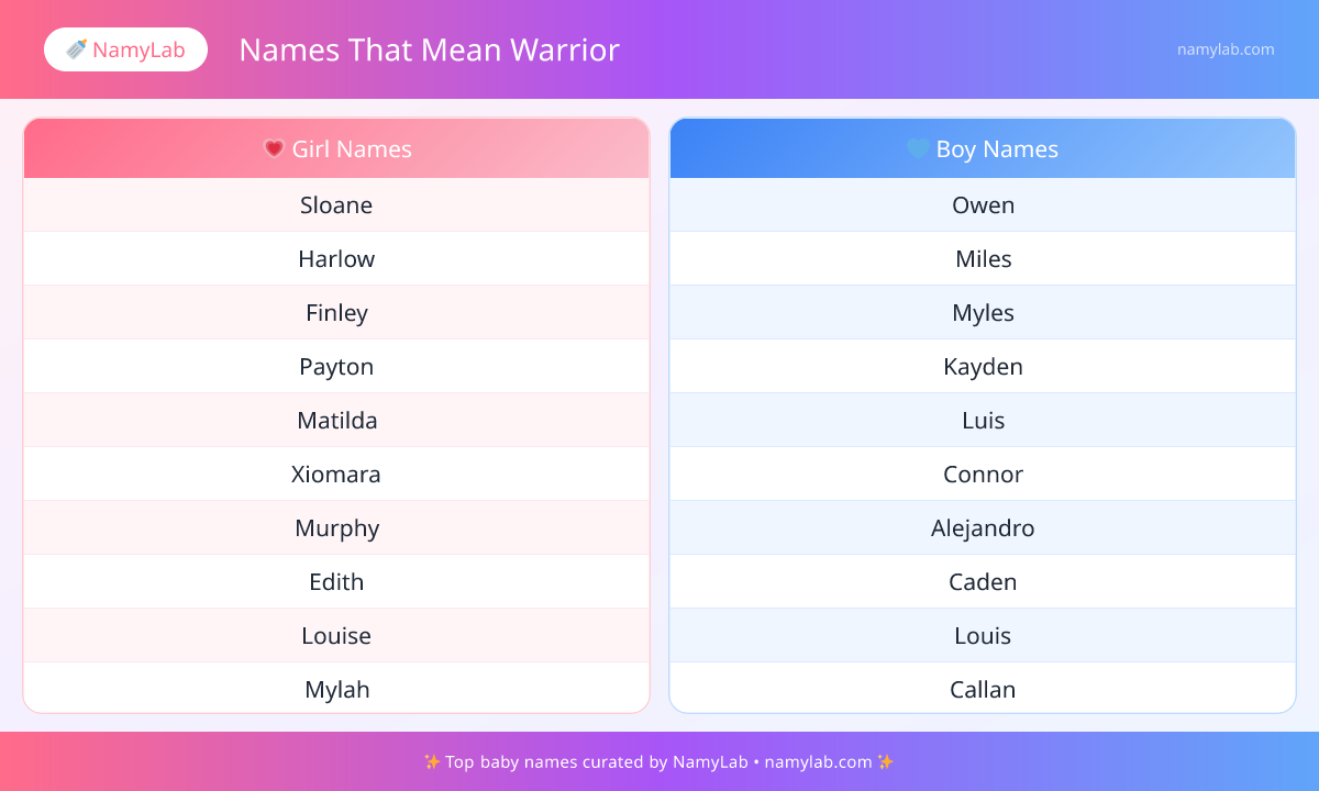 Here is a quick visual guide to the most popular names that mean warrior, organized by gender so you can spot trends and favorites instantly.