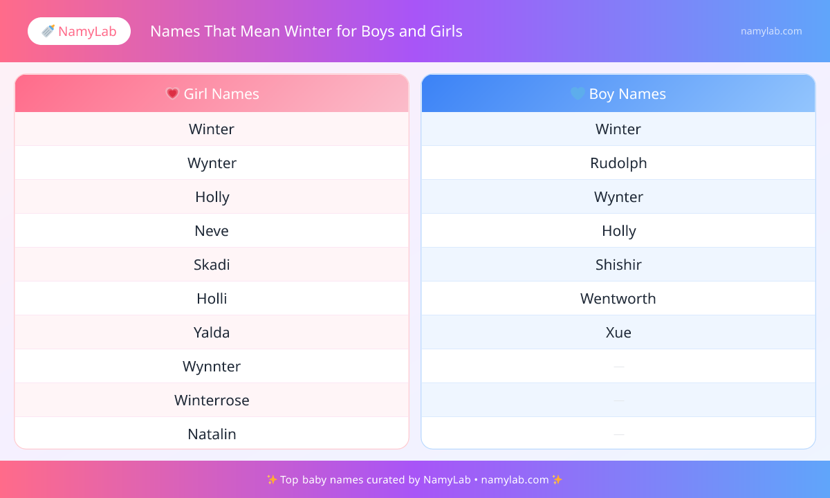 Searching for baby names that mean winter? This page curates 20+ options under "Names That Mean Winter for Boys and Girls" to help you explore meaningful choices faster. A thoughtful name shortlist starts with the right theme, and this page gathers options around that focus in one place.