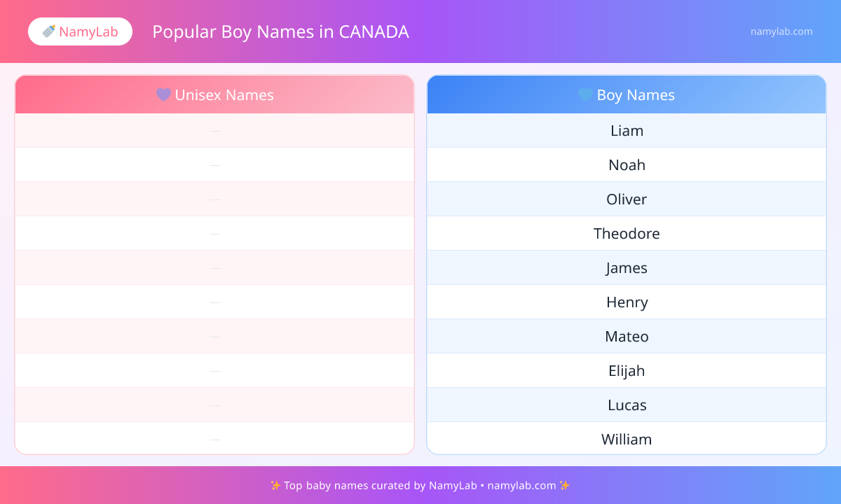 Below is a visual overview of the most popular popular boy names in canada for boys and girls. Use this snapshot to compare top picks at a glance.