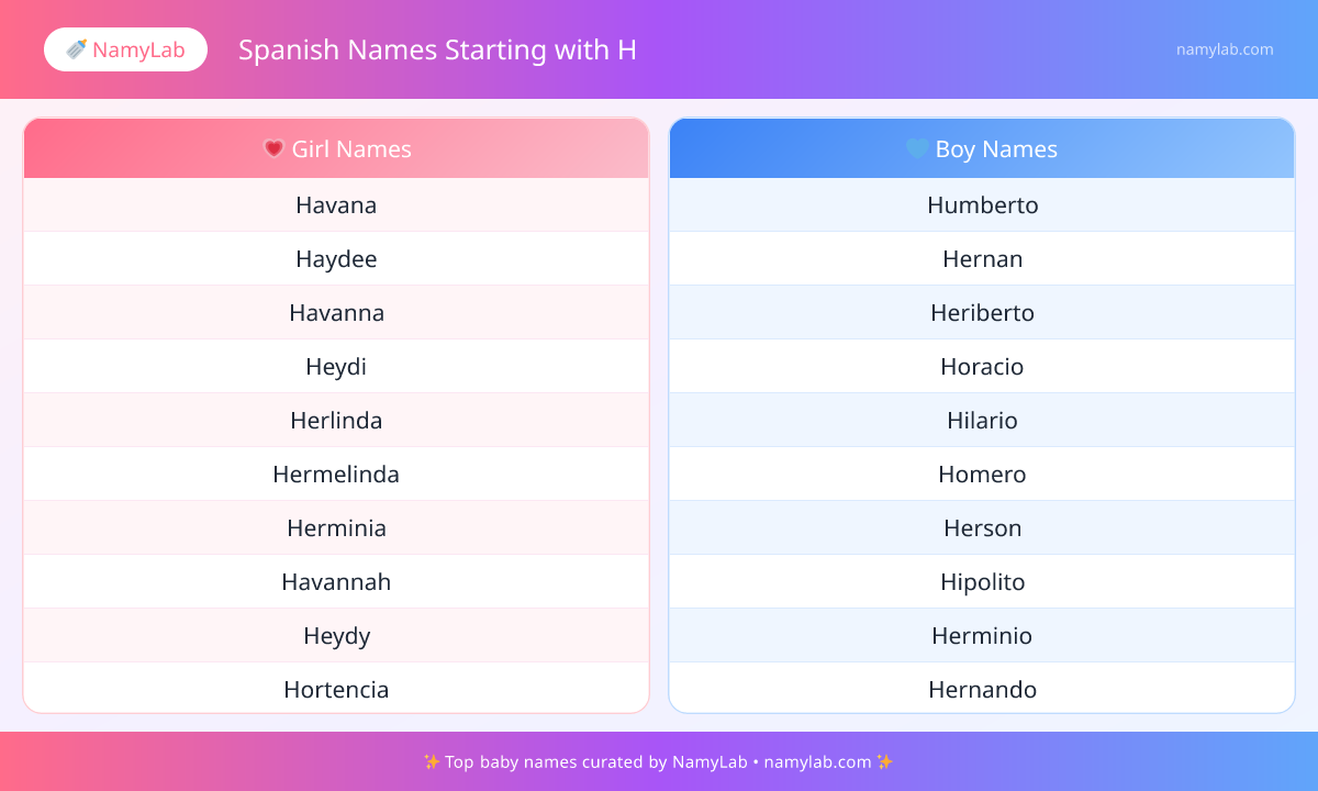 Below is a visual overview of the most popular spanish names starting with h for boys and girls. Use this snapshot to compare top picks at a glance.