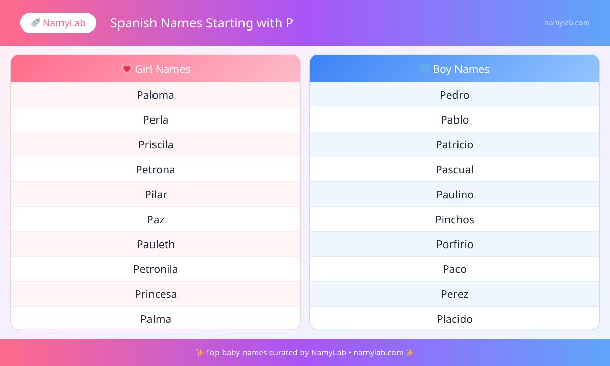 Below is a visual overview of the most popular spanish names starting with p for boys and girls. Use this snapshot to compare top picks at a glance.