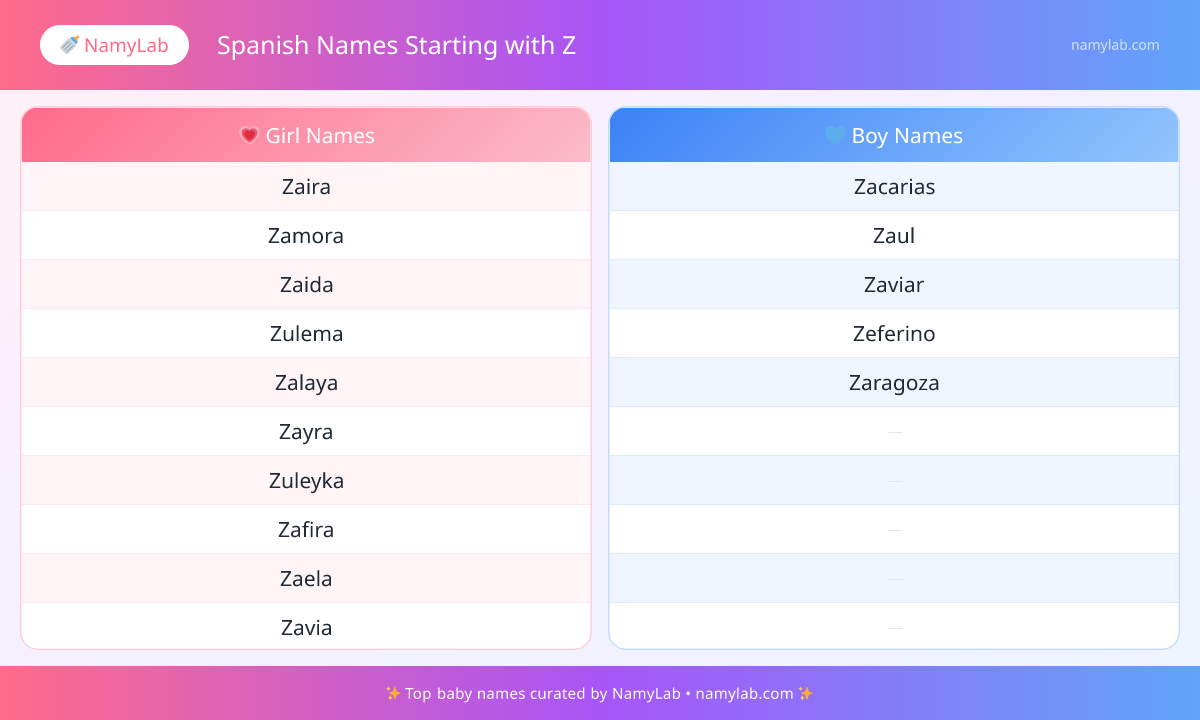 Explore the most searched spanish names starting with z side by side. The infographic below shows the leading names for both boys and girls.
