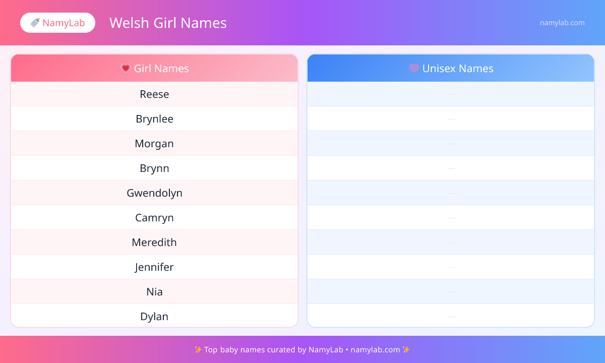 This chart highlights the top-ranked welsh girl names from our curated collection, organized by boys and girls to make comparison easy.